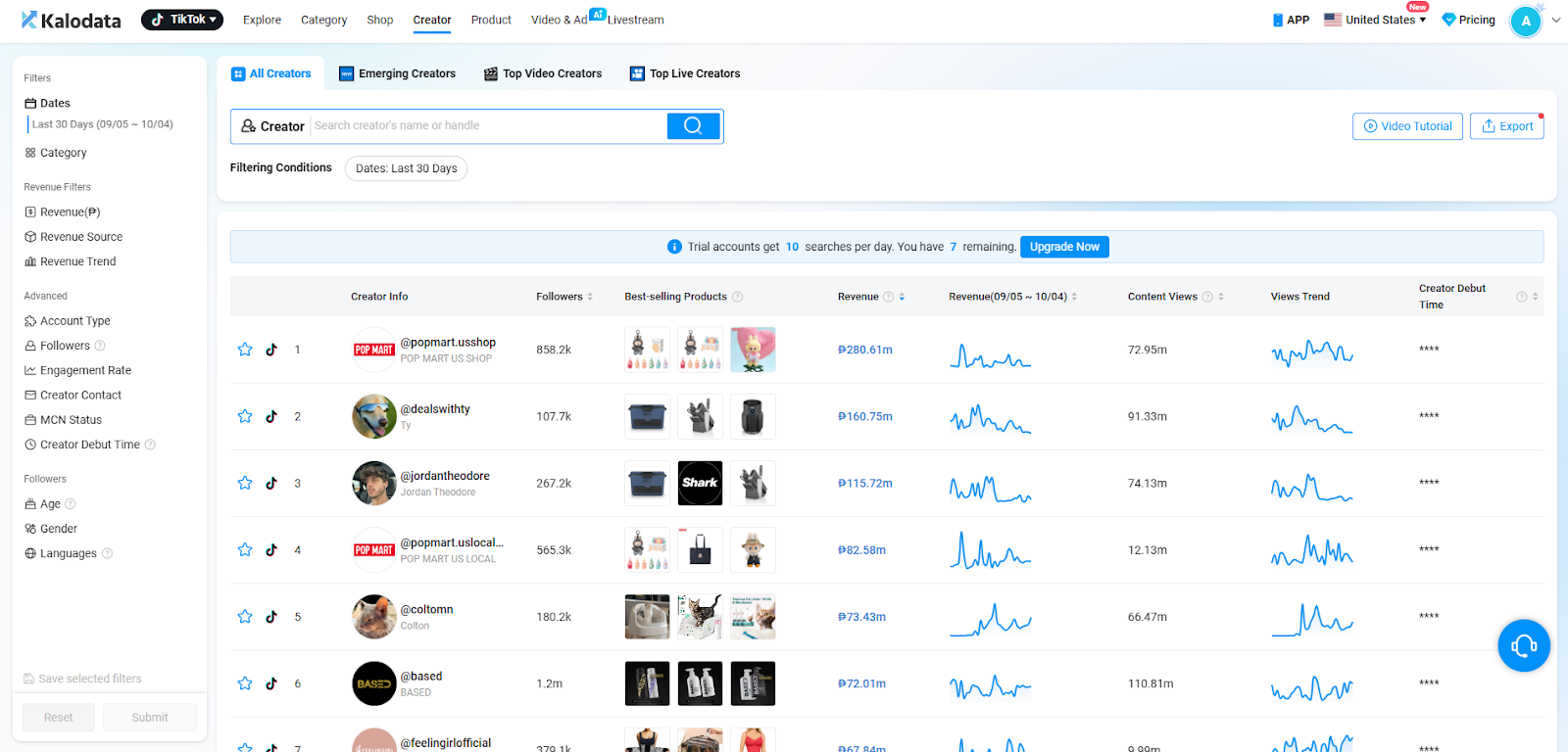 Kalodata lets dropshippers know not only what kind of items are selling in the TikTok shop, but also the best creators advertising these products and the revenue they are raking in.