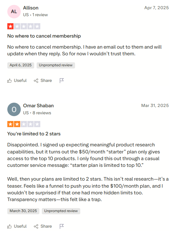 Kalodata, on the other hand, only has 4 reviews on Trustpilot with an average score of 3.4 stars. While only 2 of them have detailed reviews, neither of them is positive.