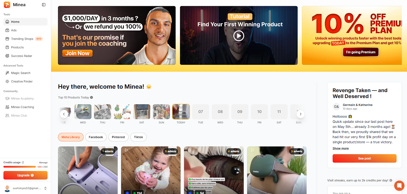 Minea, on the other hand, is the opposite. It encourages users by providing videos and tutorials on how to advertise products, and it also encourages learning by promoting its coaching and academy courses.
