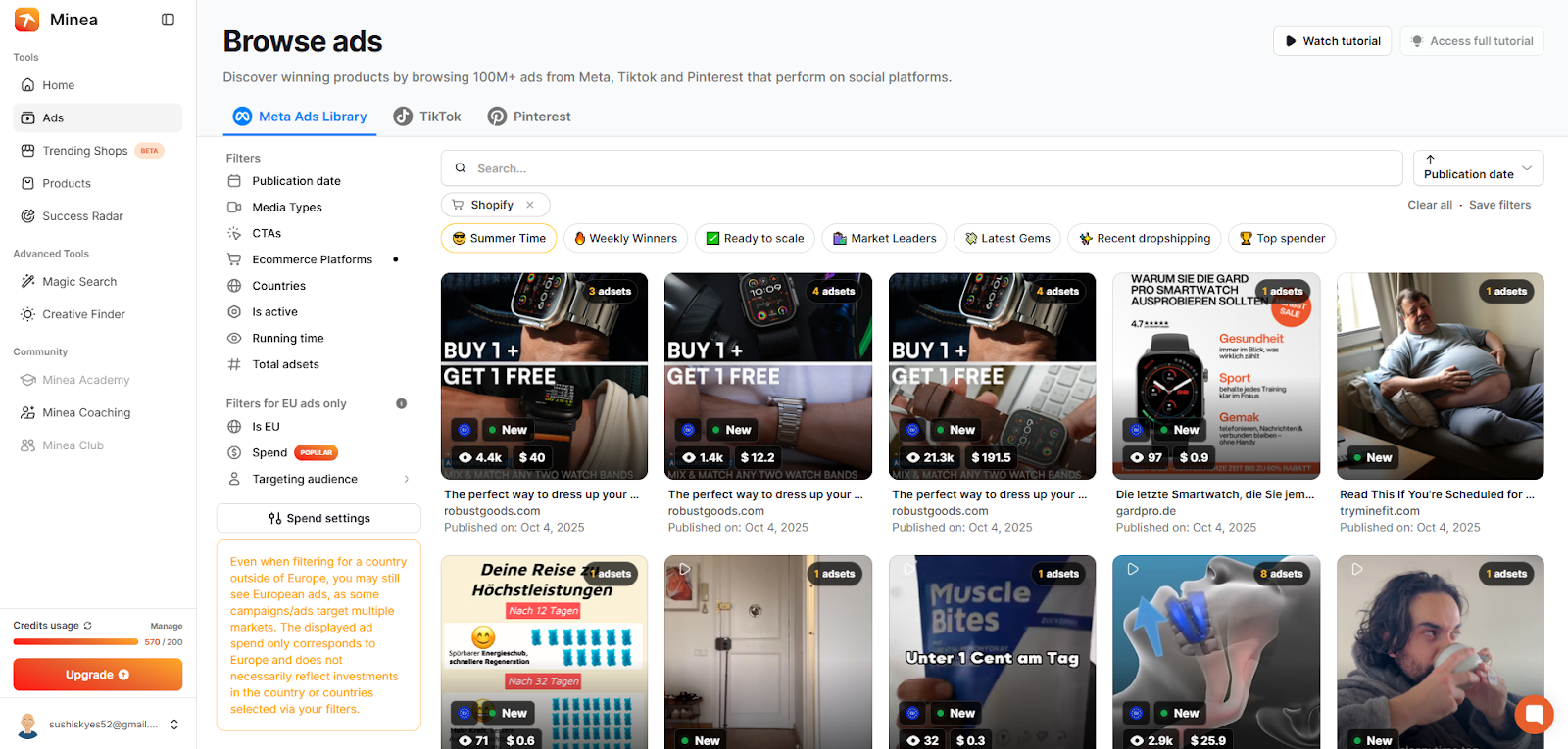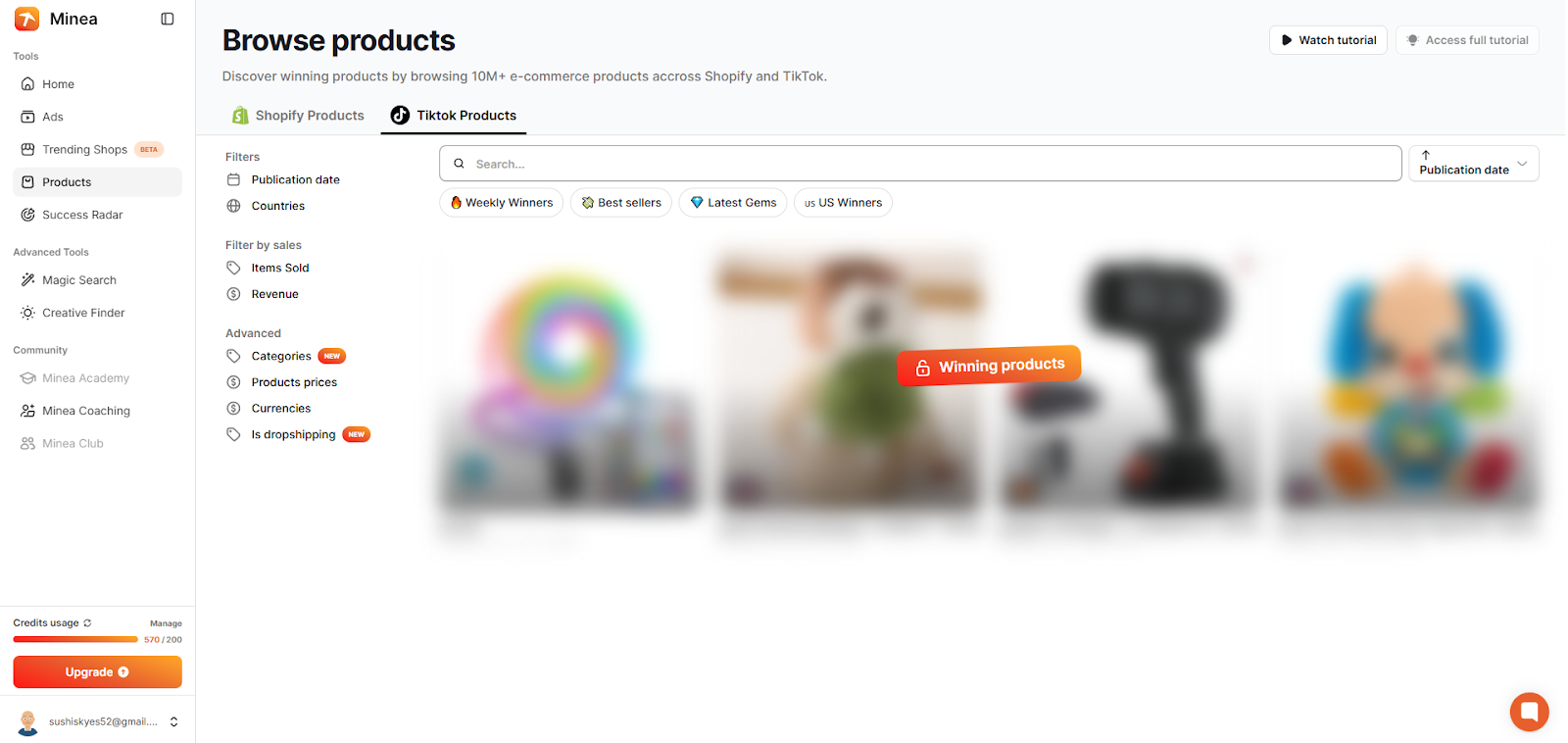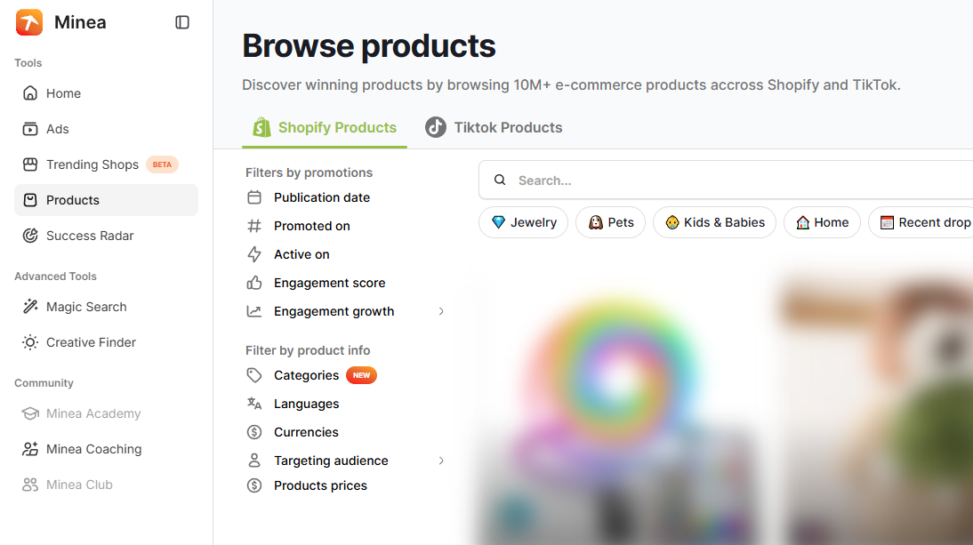 Minea shows which products are being dropshipped on TikTok and the best-selling products on Shopify.